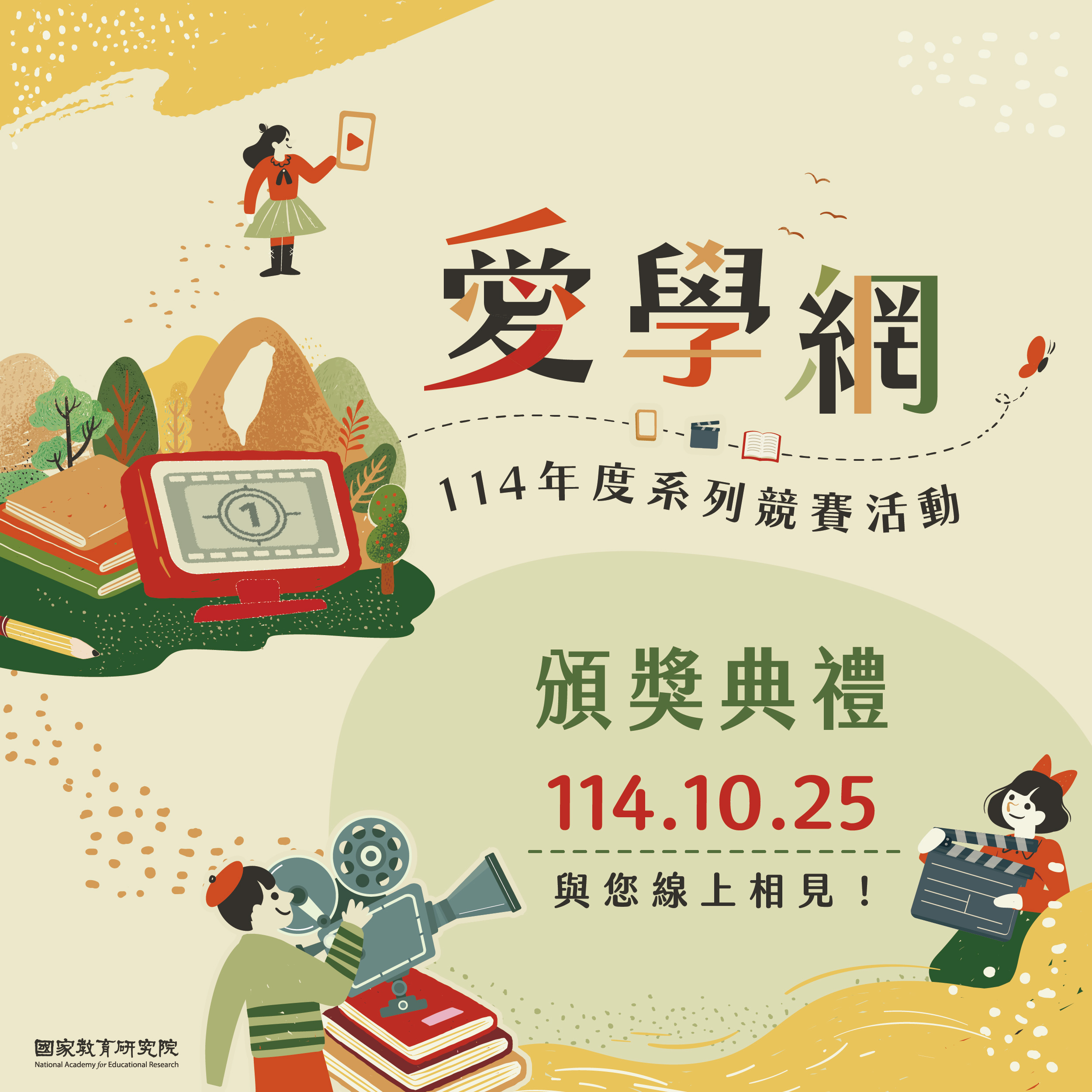 誠摯邀請全國師生及社會各界朋友,於10月25日上午10時至11時,上線參與「114年度愛學網系列競賽活動頒獎典禮」,透過按讚、分享,並參與抽獎活動,共享「教與學」的美好時刻。