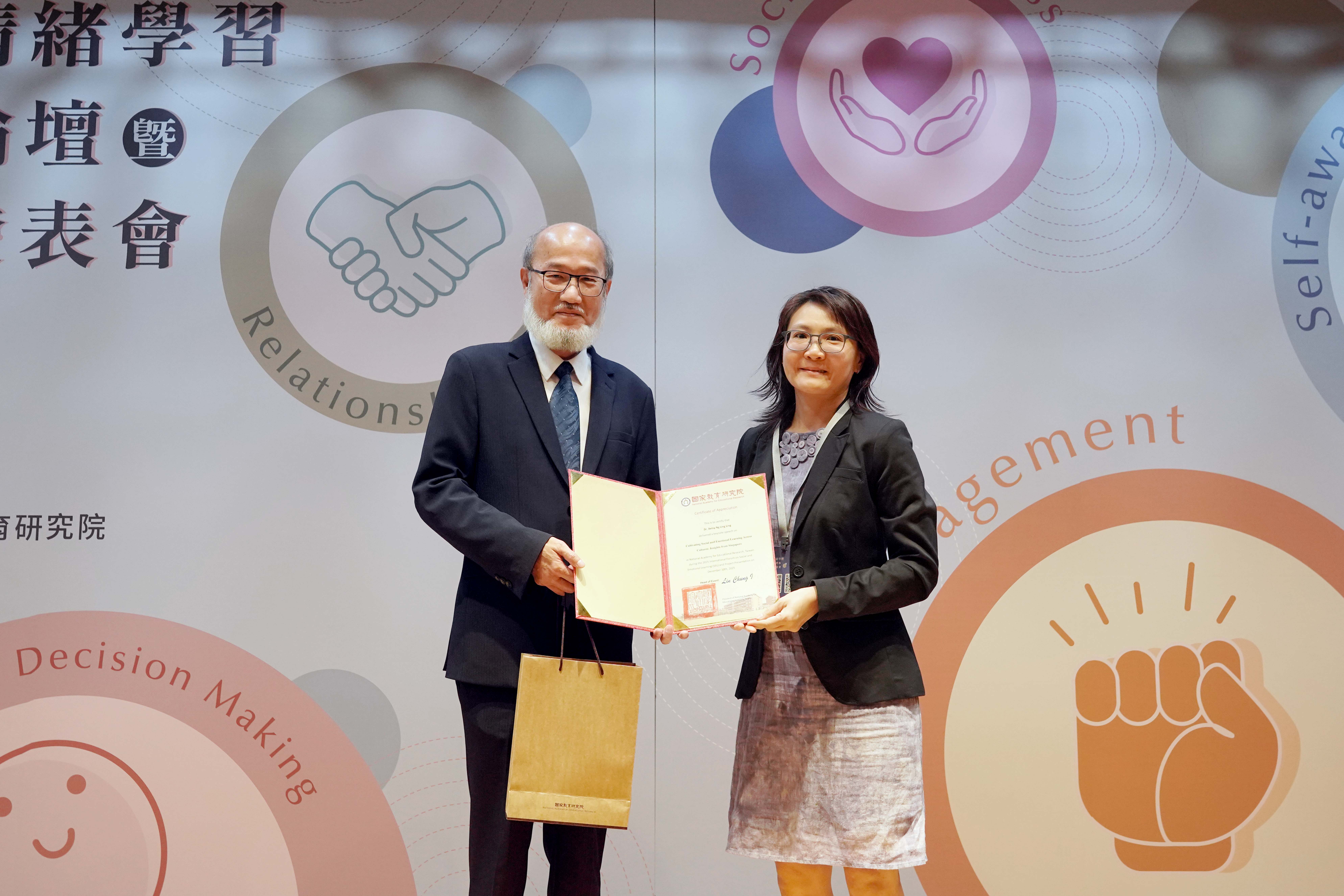 新加坡南洋理工大學Betsy Ng博士以「跨文化SEL與學習動機建構」為題,從跨文化觀點解析SEL五大核心能力,並結合自我決定理論(SDT)中的自主、能力與歸屬感,說明支持學生基本心理需求可強化其內在動機與情緒調節能力。Betsy Ng博士亦介紹小學同儕支持計畫(Peer Support Programme)的研究成果,指出同儕介入與 SEL 能力養成具有相輔相成效果,對學習動機與人際互動均具正向影響。